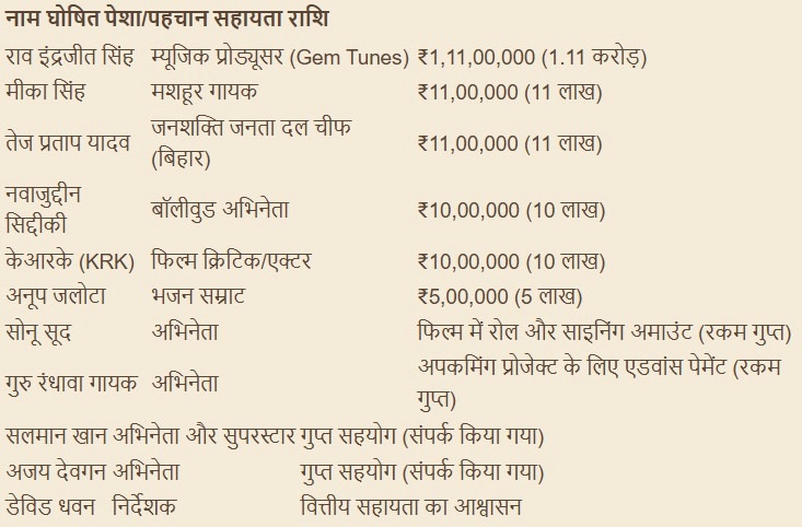 सबसे पहला नाम राव इंद्रजीत सिंह का आता है जो की एक म्यूजिक प्रोडूसर हैं उन्होंने 1.1cr. मीका सिंह 11 लाख, तेजप्रताप यादव 11 लाख, और भी कई चेहरे सामने आए हैं, मैं नीचे में आपको स्क्रीन शॉट लगा दे रहा हूँ।