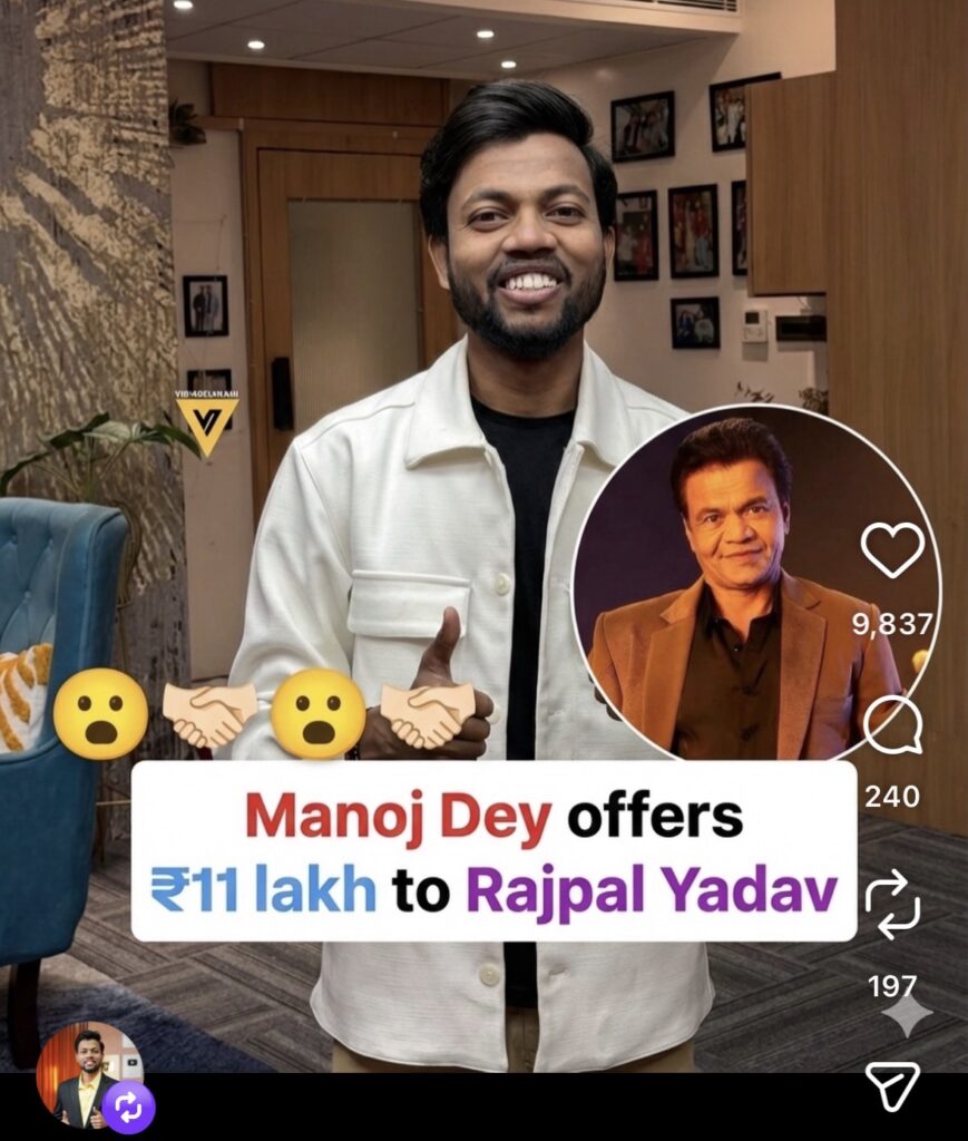 झारखंड के चर्चित यूट्यूबर मनोज दे ने भी राजपाल यादव को 11 लाख रुपये का ऑफर किया है, हालांकि उन्होंने अभी तक अपने ऑफिसियल अकाउंट से इस बात का कोई ख़ुलासा नहीं किया लेकिन उनके इंस्टाग्राम आईडी से एक पोस्ट को रीट्वीट किया गया है जिसमें की ये लिखा हुआ है “Manoj Dey offers ₹11 lakh to Rajpal Yadav”
